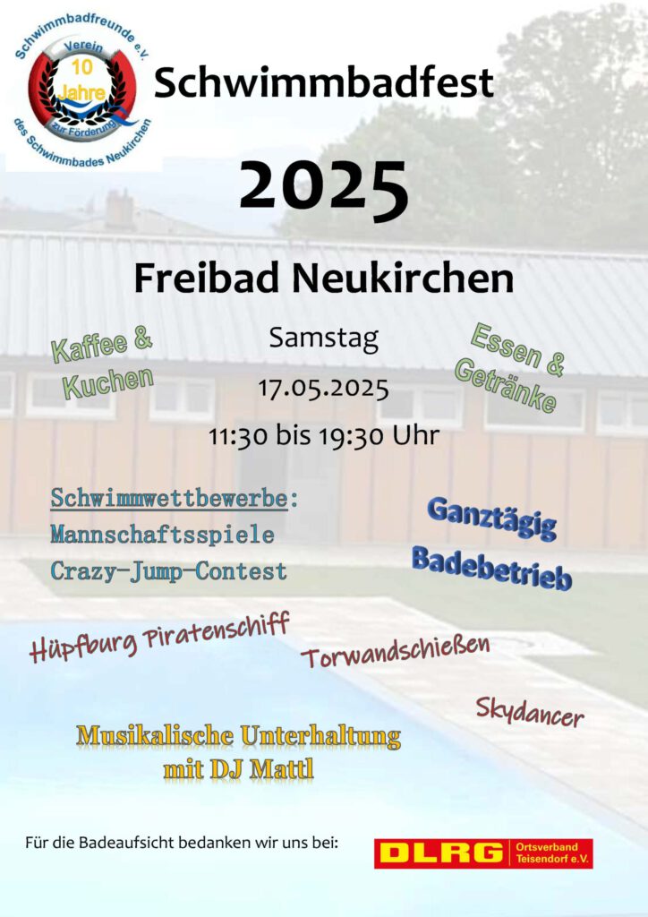 Uhrzeit von 11:30 bis 19:30 Uhr – Kaffee & Kuchen– Essen & Getränke– Schwimmwettbewerbe– Mannschaftsspiele– Crazy Jump Contest– Piratenschiff Hüpfburg– Torwandschießen– Skydance Musikalische Unterhaltung mit DJ Mattl