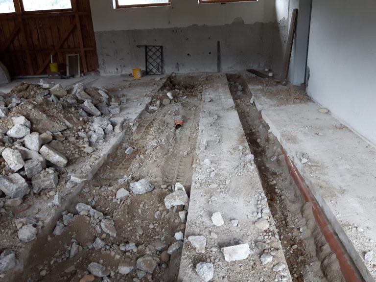Seit einigen Tagen wird wieder gearbeitet. Die Bodenplatte muss an mehreren Stellen aufgeschnitten und die Abwasserleitungen neu verlegt werden. Erst danach kann mit dem Innenausbau begonnen werden.