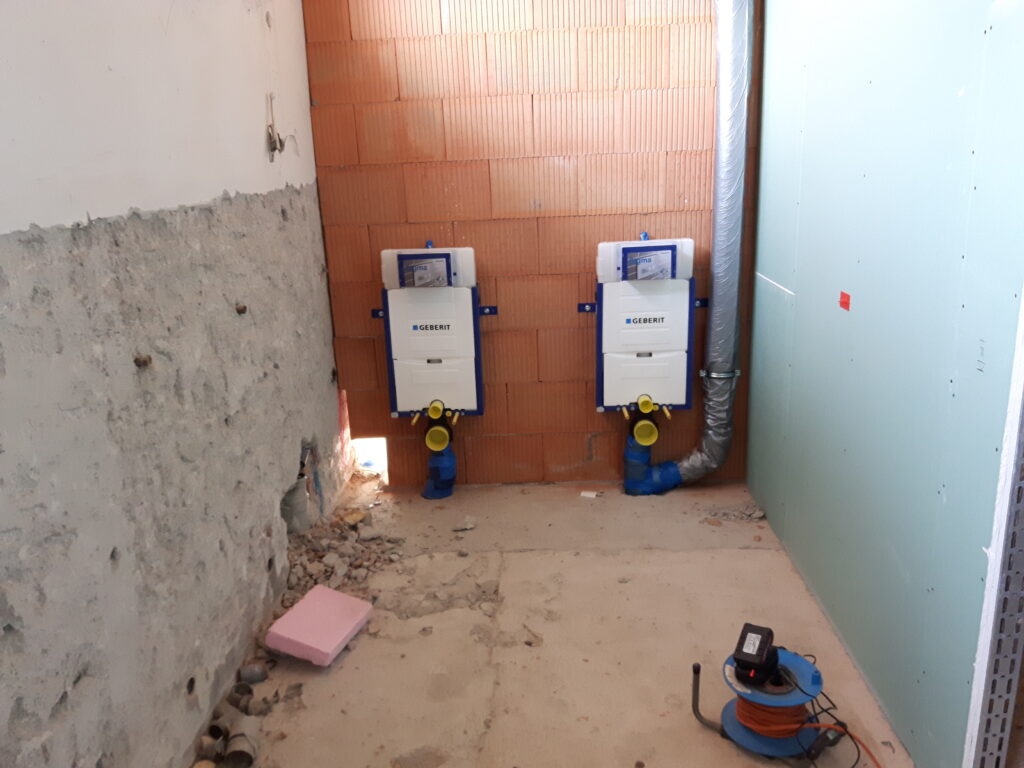 In der vergangenen Woche hat sich wieder einiges verändert. Es wurde mit den Sanitär-Installationen in den WC begonnen. Und am Samstag haben wir wieder einige Zwischenwände und den Eingangsbereich umgebaut.