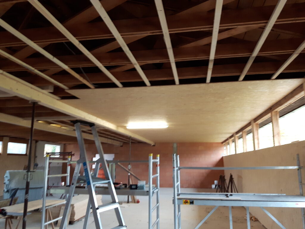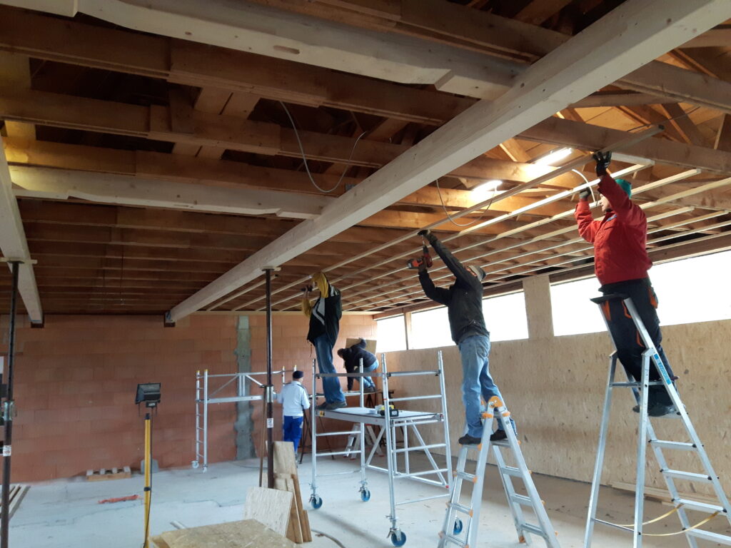 Da wir auf professionelles Werkzeug und genügend Helfer zurückgreifen konnte gingen die Arbeiten gut voran. in 34 Arbeitsstunden  wurde ca.80m2 Unterkonstruktion und 65m2 Decke montiert. Und endlich ist auch etwas von der vielen Arbeit zu sehen.