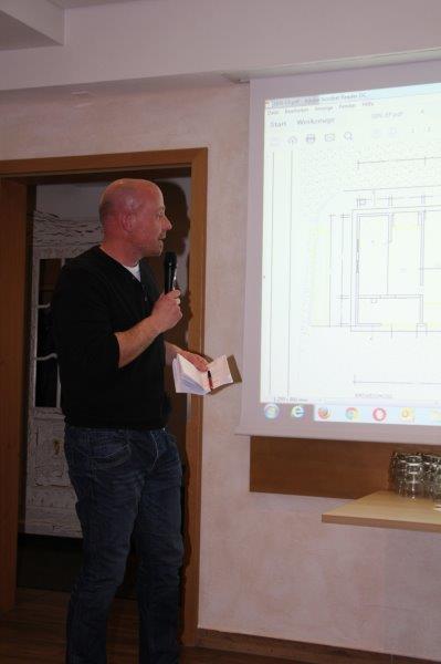 Nach der Beauftragung des Planungsbüros Planquadrat Fritsche konnte mit den Abbrucharbeiten begonnen werden. In einer Präsentation erklärte Hans Helminger die einzelnen Bauschritte. Hans Helminger hob dabei den unermüdlichen Einsatz der ehrenamtlichen Helfer hervor, die bereits 400 Arbeitsstunden geleistet haben. Außerdem bedankte er sich bei den örtlichen und umliegenden Firmen für das kostenlose Bereitstellen von Baugerät und Werkzeugen. In diesem Zusammenhang zeigte sich Hans Helminger beeindruckt von der Unterstützung, die er bisher erfahren hat und dankte allen Arbeitern und Brotzeitspendern von ganzem Herzen. Mit einem ganzen Dorf hinter sich, kann er den anstehenden Sanierungsarbeiten zuversichtlich entgegenblicken.